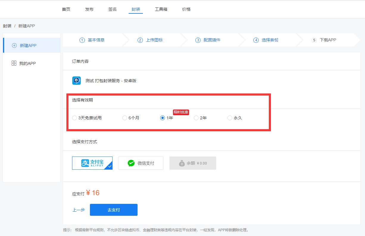 第一步、点击封装按钮,到封装APP首页,红色框为封装APP流程。